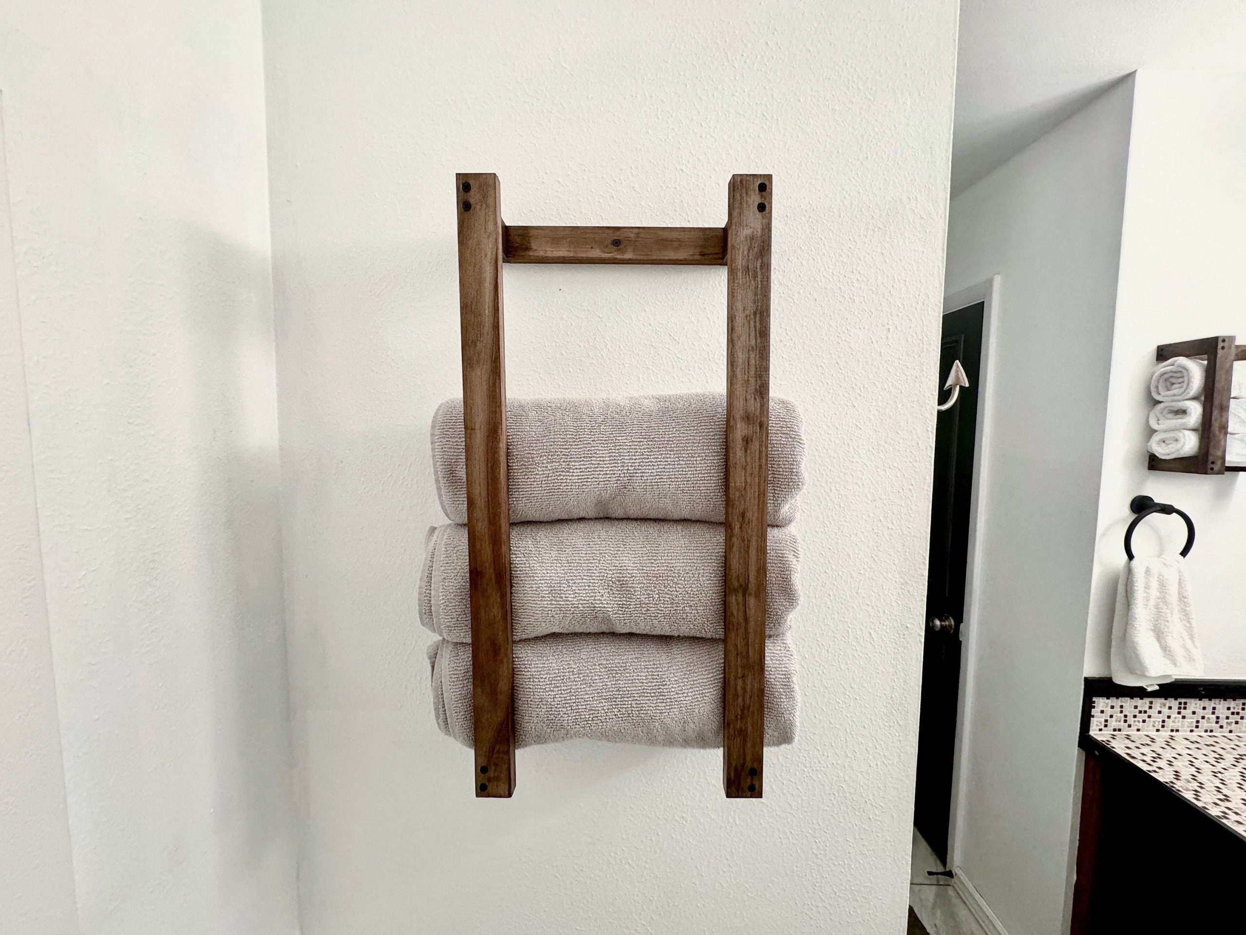 Handmade floating towel racks, perfect for bathrooms, kitchens, or living rooms. Shown in Provincial stain. Dimensions: Towel Rack 24”H x 11.5”W x 5.5”D, Hand Towel Rack 12”H x 9”W x 5”D. Includes mounting screws.